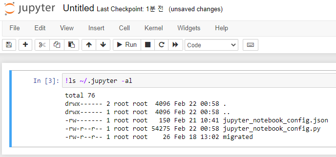 예를 들면 !ls -al ~/.jupyter 와 같이 입력하면 아래와 같은 화면을 볼 수 있다.
